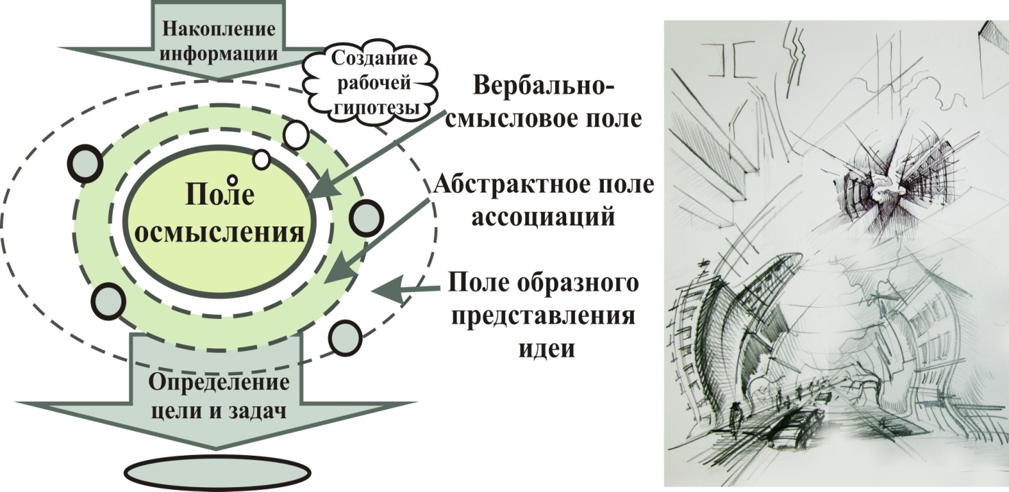 Блок «поле осмысления» – это стадия размышления о поставленных задачах; область зарождения замысла, формулирования целей и задач, а также методов и способов ее реализации. Очень важно суметь сфокусировать имеющуюся информацию через подачу ее сущностной стороны содержания и действия на языке архитектурного профессионального мышления, вербального и образно-графического представления замысла (рис. 4.).