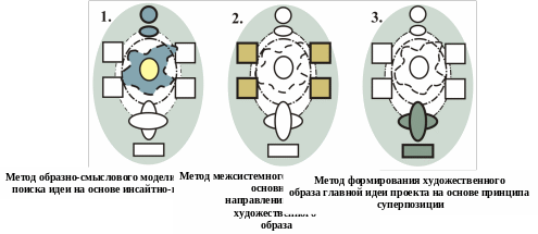 Формирование главной идеи проектного решения на этапе творческого поиска предлагается выполнять на основе рассмотрения трех методов, включающих в себя определенные блоки проектных действий [5] (рис. 3).