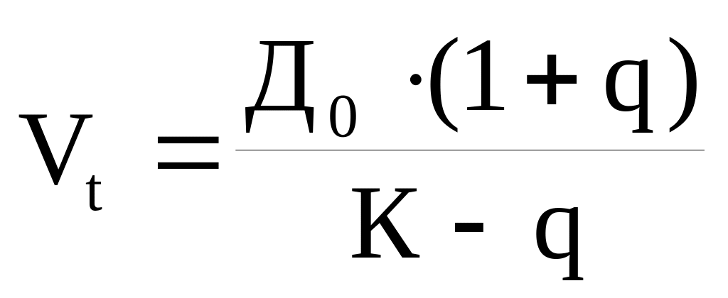 Если известна цена в к-ый период, то приведенная текущая стоимость (Vt) равна сумме дисконтированных денежных потоков (дивидендов) при темпах роста q плюс дисконтированная цена акций в К-й период.
