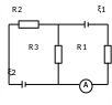 50. В схеме, представленной на рисунке, ξ1=110В, ξ2=220В, R1 = R2 = R = 100 Ом, R3 = 500 Ом. Найти показание амперметра. Внутренними сопротивлениями амперметра и элементов пренебречь.