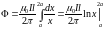 Разобьём площадь рамки на узкие элементарные площадки длиной l, шириной dx и площадью dS=ldx (см. рис.). В пределах этой площадки магнитную индукцию можно считать постоянной, так как все части площадки равноудалены (на расстояние x) от провода. С учётом сделанных замечаний элементарный магнитный поток можно записать в виде