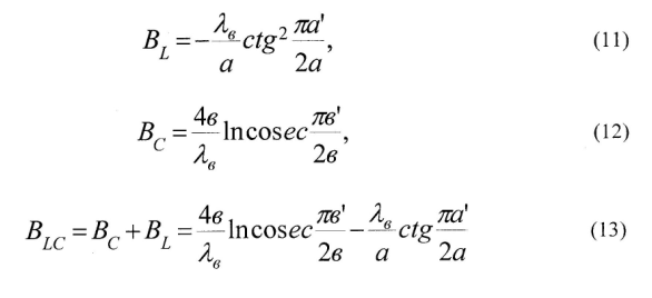 2.3. Задание третье. Произвести расчет нормированных реактивных проводимостей для индуктивной (рис. 4), емкостной (рис. 5) и резонансной (рис. 6) диафрагм, приняв при этом равными: λ=3,6 см; а = 2,3 см; в = 1 см;