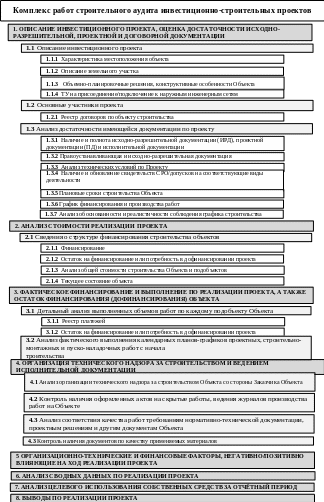 Основной комплекс работ, производимый в рамках строительного аудита инвестиционно-строительного проекта и отражаемый в отчете, приведен на рисунке.