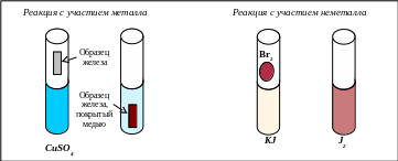В пробирку наливается раствор сульфата меди и в него помещается образец железа. Через некоторое время на железе появляется красно-коричневый налёт мелкодисперсной меди и уменьшается интенсивность окраски раствора, обусловленная гидратированными ионами меди. Схема происходящей окислительно-восстановительной реакции: