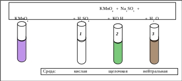 В три пробирки наливается фиолетово-розовый раствор перманганата калия. В первую пробирку наливается раствор серной кислоты (кислая среда), во вторую − раствор КОН (щелочная среда), в третьей пробирке среда остаётся нейтральной. Затем в каждую пробирку добавляется сульфит натрия.