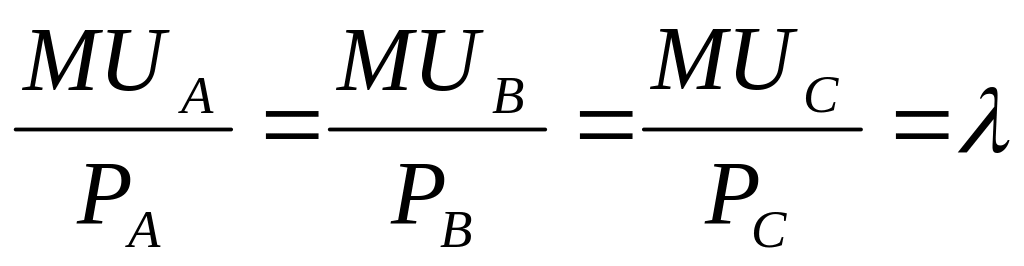 где MUA, MUB, MUC -предельные полезности товаров А, В, С; λ - некоторая величина, характеризующая предельную полезность денег;