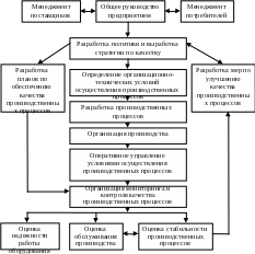 Логика осуществления процессов, приведенных на рис. 4.2, состоит в следующем. Исходной точкой для организации процессов являются требования потребителей, выработанные на основе маркетинговых исследований рынка и реализации политики предприятия в области качества.