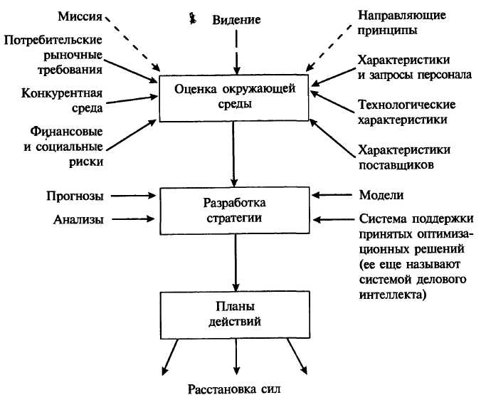 Стратегические цели — это то, что организация должна изменить или улучшить, чтобы остаться конкурентоспособной. Они обычно фокусируются на внешнюю для организации среду и связаны с потребителями рынком, товаром, услугой или технологическими возможностями и вызовами. Другими словами, стратегические цели задают долгосрочную направленность деятельности организации и помогают ее руководителям принимать решения о распределении ресурсов. Например, стратегической целью поставщика, действующего в очень конкурентной отрасли, может быть занятие позиции ценового лидера и ее сохранение. На основе стратегии разрабатываются конкретные планы действий, где четко описывается то, что нужно сделать, планы использования человеческих ресурсов, вспомогательные показатели и индикаторы функционирования, а также планы размещения ресурсов. В обобщенном виде этот процесс представлен на рис. 8