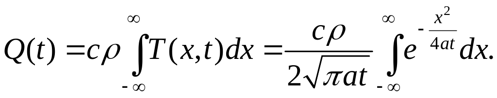 Будем теперь уменьшать h, устремляя его к нулю, считая количество тепла неизменным, т.е. введем понятие мгновенного точечного источника тепла мощностью Q0 , помещенного в момент t = 0 в точке x = 0. При этом распределение температур в стержне будет определяться формулой