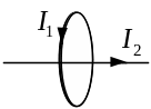 3. Прямолинейный проводник с током I2 проходит по оси кругового тока I1. С какой силой взаимодействуют токи?