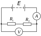 3. Чему равно показание амперметра при следующих параметрах схемы: E = 6 В, R1 = 4 Ом, R2 = 6 Ом, RV = 12 Ом?