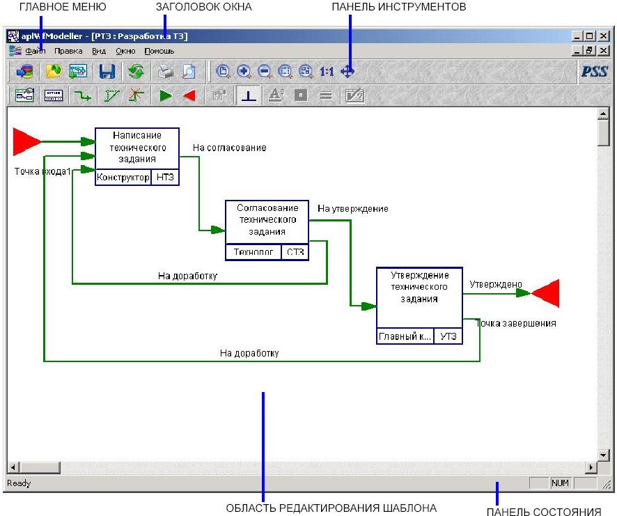 Для формализованного описания делового процесса, т.е. для описания шаблона процесса, служит графический модуль «Редактор шаблонов процессов», входящий в состав PSS.