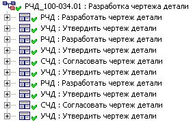 После выполнения всех заданий рабочий процесс автоматически завершается (состояние процесса - «Выполнен»). Процесс отображается (у владельца) в дереве объектов PDM модуля с иконкой . При раскрытии выполненного процесса отображаются все выполненные задания, т.е. история процесса.