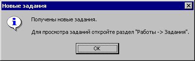 Для получения новых заданий необходимо в главном меню модуля PDM выбрать пункт «Почта → Получить задания». Также, задания получаются при выборе команды «Показать содержимое» контекстного меню «Работы → Задания». Для автоматической проверки поступления новых заданий необходимо в окне настроек работы модуля PDM(команда главного меню «Настройки → Настройки работы») установить флажок «Автоматически проверять новые задания каждые» и указать необходимый период. Если при присоединении к БД или во время работы были получены новые сообщения, система выведет следующее сообщение: