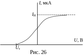 Измерение энергии (в электронвольтах: 1эВ = 1,6·10-19 Дж) фотоэлектронов можно провести, используя вакуумные или газонаполненные фотоэлементы, действие которых основано на внешнем фотоэффекте. В фотоэлементе вблизи фотокатода - электрода, испускающего фотоэлектроны под действием света, располагается второй электрод – анод, на который подается задерживающий ( 0) или ускоряющий ( 0) потенциал. При достаточно больших ускоряющих напряжениях U между фотокатодом и анодом фототок I достигает насыщение (рис. 26), в этом случае все фотоэлектроны попадают на анод.