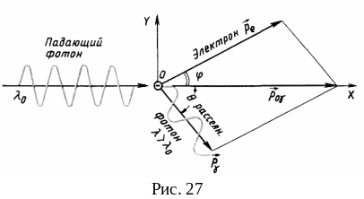 Эффект Комптона. Эффектом Комптона называется изменение частоты или длины волны фотонов рентгеновского и гамма-излучений (у видимого, УФ и ИК излучений эффект Комптона не наблюдается) при их рассеянии электронами и нуклонами вещества. Комптон обнаружил, что если рентгеновское излучение с длиной волны 0 рассеивается веществом (например, углеродом или металлом), то в рассеянном потоке наряду с излучением с той же длиной волны 0 наблюдается излучение с большей длиной волны (рис. 27) и изменение длины волны равно: