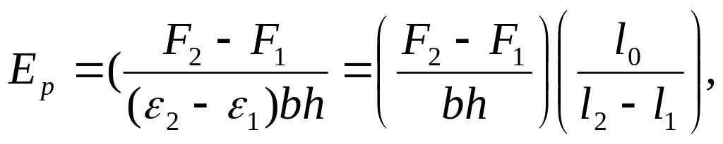 где F1 – нагрузка в Н на образец ПКМ при относительном удлинении ε1 = 0,1%; F2 – нагрузка в Н на образец ПКМ при относительном удлинении ε2 = 0,3%; l1 – удлинение образца в мм при ε1 = 0,1%; l2 – удлинение образца в мм при ε2 = 0,3%; l0 – рабочая зона экстензометра или другого измерителя деформации, мм.