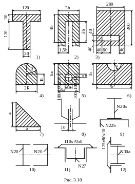 3.10. Для сечений, показанных на рис. 3.10, определить осевые моменты сопротивления.
