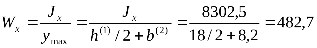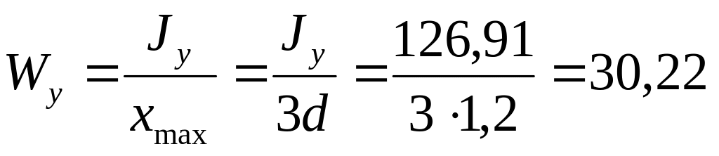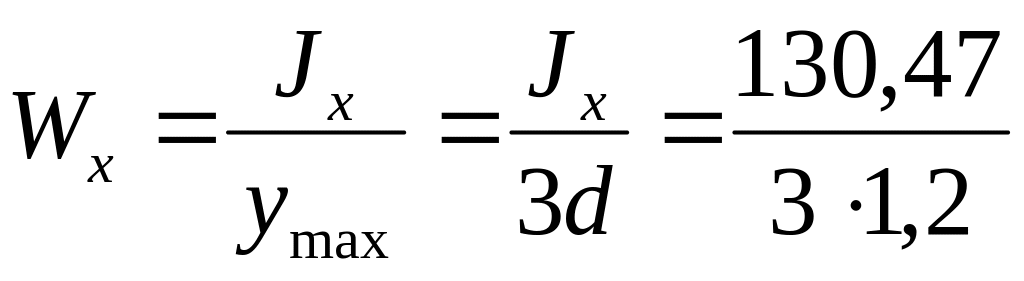 Моменты сопротивления сечения Wx = Jx / ymax, Wy = Jy / xmax, где Jx, Jy – главные центральные моменты инерции; ymax, xmax – координаты точек сечения, наиболее удаленных от главных центральных осей.