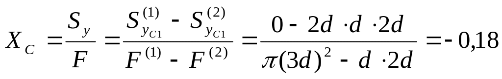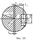 Тогда для установления положения центра тяжести сечения достаточно определить одну координату ХС. При ее оп-ределении заштрихованную площадь можно рассматривать как разность площадей круга (1) и прямоугольника (2), (см. рис. 3.9).
