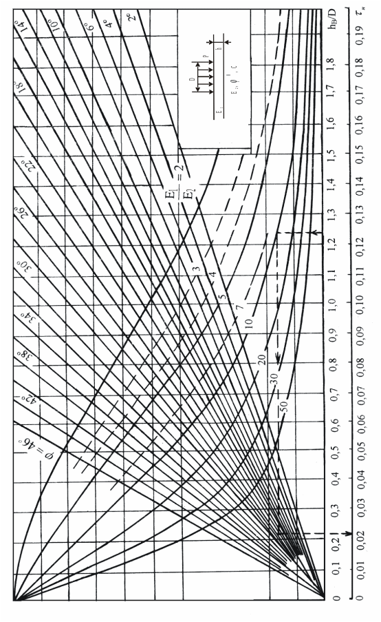 Рис.3.6. Номограмма для определения активного напряжения сдвига от временной нагрузки в нижнем слое двухслойной системы (при h/D = 0÷2,0) |