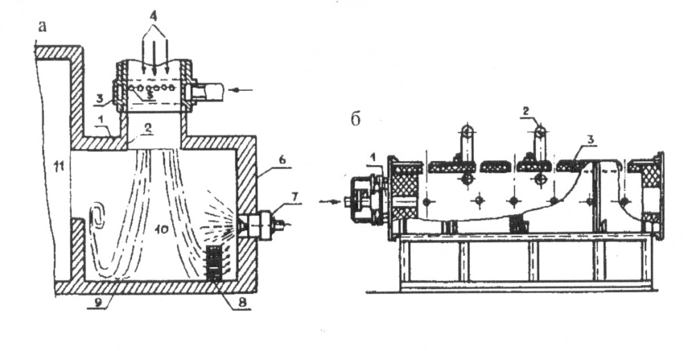 Рис. 62. Конструкции топочных устройств: А – камерная печь; 1 – корпус печи; 2 – отверстие; 3 – коллектор; 4 – газообразные отходы; 5 – распределительные патрубки; 6 – фронтовая стена; 7 – горелка; 8 – перфорированная стенка; 9 – под; 10 – камера; 11 – камера для утилизации тепла; б – циклонная горизонтальная печь; 1 – горелка; 2 – цилиндрическая камера; 3 – патрубки для отвода газа