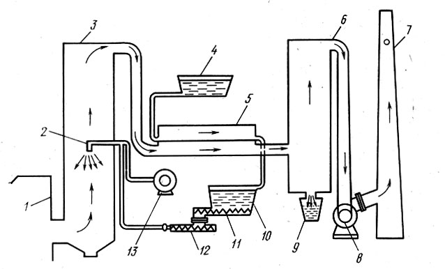 Рис. 74. Схема установки для сжигания осадков сточных вод: 1 – топочная камера; 2 – распылитель; 3 – камера для сжигания осадка; 4 – бак для уплотненного осадка; 5 – теплообменник; 6 – фильтр; 7 – дымовая труба; 8 – дымосос; 9 – отстойник; 10 – бак подогретого осадка; 11 – шнековый транспортер; 12 – насос; 13 - компрессор
