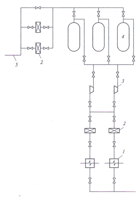 Рис. 80. Схема газгольдерной установки для выдержки газов в период перезагрузки: 1 – охладитель газов; 2 – аэрозольный фильтр; 3 – компрессор; 4 – газгольдер; 5 – выход газов к вентиляционной трубе |