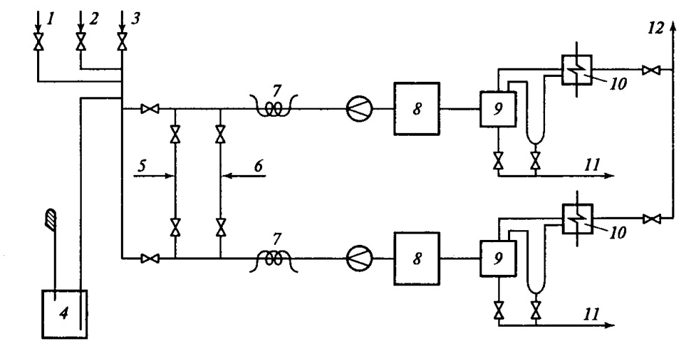 Рис. 82. Схема установки для сжигания гремучей смеси на АЭС: 1 – подвод от пускового эжектора; 2 – подвод от технологического конденсатора; 3 – выхлоп основных эжекторов; 4 – гидрозатвор; 5 – подвод воздуха; 6 – подвод пара; 7 – нагреватель; 8 – контактный аппарат; 9 – сепаратор; 10 – охладитель; 11 – отвод конденсата; 12 – отвод газов в камеры выдержки |