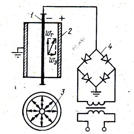 Ударная ионизация газа протекает устойчиво лишь в неоднородном электрическом поле, характерном для цилиндрического конденсатора. В зазоре между коронирующим и осадительным электродами создается электрическое поле. Напряжение к электродам подается от выпрямителя.