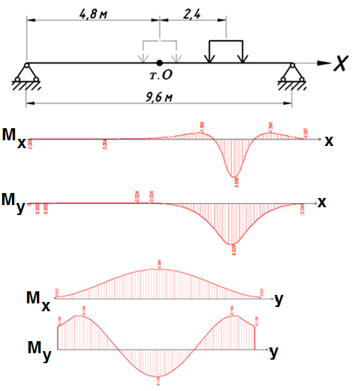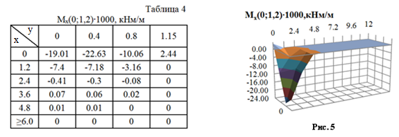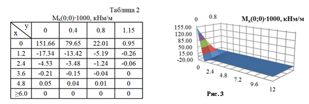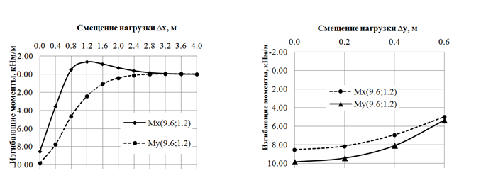 И наоборот, когда нагрузка смещается вдоль оси у, то в продольных сечениях экстремальные значения изгибающих моментов Мх, Му имеют место также вдоль оси у, а в поперечных – располагаются под нагрузкой. Графические результаты представлены на рис. 9, 10.
