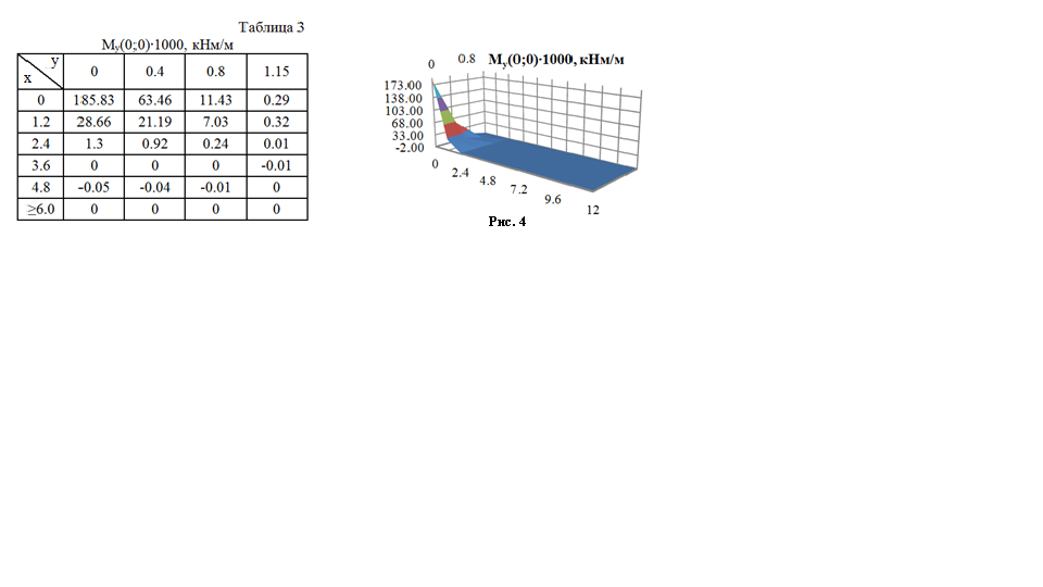При расчете неблагоприятного расположения временной нагрузки принято использовать поверхности влияния [4]. В данной работе исследование зависимости изгибающих моментов Мх, Му и прогибов W в центре плиты как наиболее характерных, а также изгибающих моментов в центре защемленных сторон от эксцентричности расположения одиночной колесной нагрузки выполнялось посредством построения поверхностей влияния в ПК ЛИРА. В силу симметрии соответствующие матрицы влияния представлены в табл. 1-7 и на рис. 2-8 для четверти плиты.