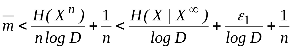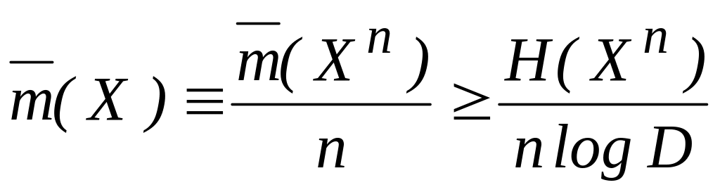 где D — число элементов в множестве А. Первое неравенство обращается в равенство в том и только том случае, когда символы на выходе кодера статистически независимы и равновероятны. Второе неравенство должно выполняться вследствие требования однозначности кодирования: среднее количество информации в кодовых словах не может быть меньше, чем среднее количество информации в сообщениях, которые отображаются с помощью этих слов. Последнее неравенство — следствие предположения о стационарности источника. Для достаточно хорошего кода (и соответственно кодера) среднее число символов на сообщение должно быть близким к Н ( X | X ) / log D, т. е.