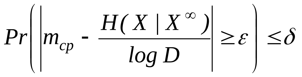 При кодировании с помощью равномерных кодов никаких дополнительных проблем не возникает. Если источник эргодический, то с высокой вероятностью для кодирования L сообщений будет использовано примерно L Н ( X | X ) / log D кодовых символов. Если n— длина кодируемых сообщений, то на каждые n сообщений источника появляется одно кодовое слово длины nRlog D, где R—скорость кодирования. Число n определяет, с одной стороны, близость R и Н(X|X), а с другой достижимую вероятность ошибки. Выбирая n достаточно большим, можно для сколь угодно малых положительных и сделать R= Н ( X | X )+ и сделать вероятность ошибки меньшей или равной .