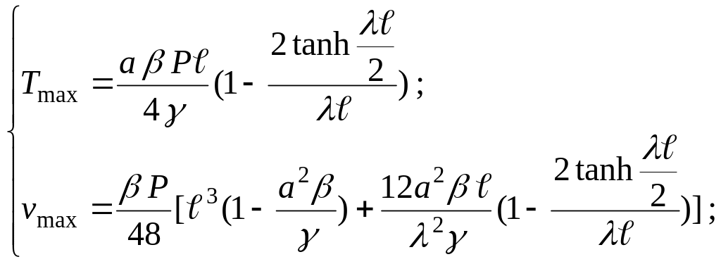 Ввиду громоздкости выражений, получаемых в результате данных действий, ниже приводятся только максимальные значения основных функций T и v, которых они достигают в середине пролета балки. При этом заданная нагрузка разделяется на два типовых случая: