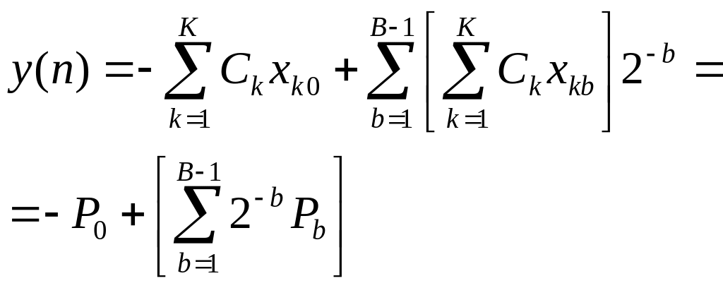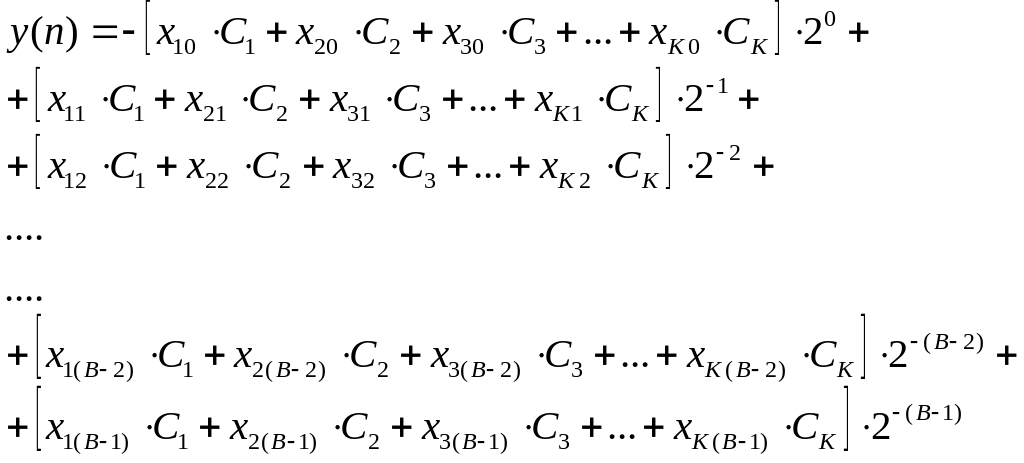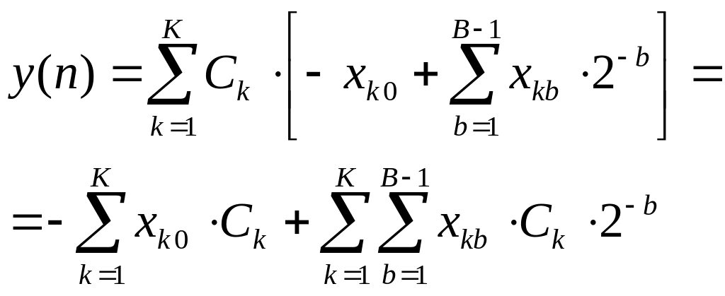Рассмотрим уравнение КИХ-фильтра (нерекурсивного цифрового фильтра с конечно-импульсной характеристикой) которое представляется как арифметическая сумма произведений: