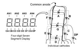 Сегменты дисплея имеют нумерацию согласно рисунку ниже и имеют следующие обозначения: A(seg<0>), B(seg<1>), C(seg<2>), D(seg<3>), E(seg<4>), F(seg<5>), G(seg<6>).