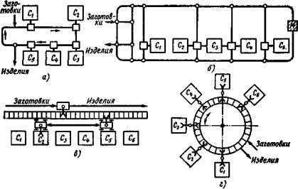 Рис. 12. Принципиальные схемы компоновок автоматических линий: а — с жесткой технологической связью;