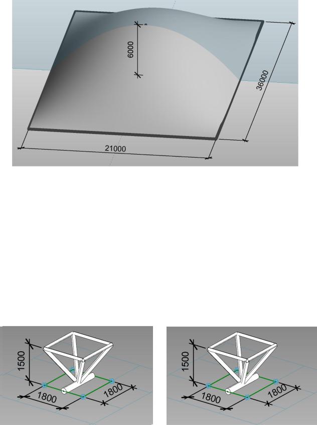 Рассмотрим компьютерные модели покрытия криволинейного пространственного очертания для здания прямоугольной формы в плане с размерами 21x36 м. В первой модели покрытия выберем две опорные точки покрытия на одной отметке вдоль одной из координационных осей и еще две опорные точки - на 3 м выше и на 3 м ниже относительно первой опорной линии по второй координационной оси. В шаблоне для создания моделей используя вкладки «Семейства -Новые концептуальные формы», через указанные точки проведем два сплайна – две кривые линии с стрелой подъема в середине пролета f=1,8 м (рис. 1). Выделяем данные линии и нажав кнопку на панели – «Создать форму» получаем поверхность №1 (рис. 2). Вторая модель покрытия будет иметь четыре опорные точки на одинаковой отметке, а сплайн, образующий поверхность, зададим по длине пролета 36 м со стрелой подъема, равной f=6 м (рис. 3). Мы создали две поверхности двоякой положительной гауссовой кривизны. Полученные модели необходимы для создания решетчатой конструкции покрытия описывающей поверхности №1 и №2 (см. рис. 2, 3). Элементы нижних поясов решетчатых конструкций будут повторять геометрию криволинейной поверхности. Структурные конструкции покрытий будут описывать данные поверхности.