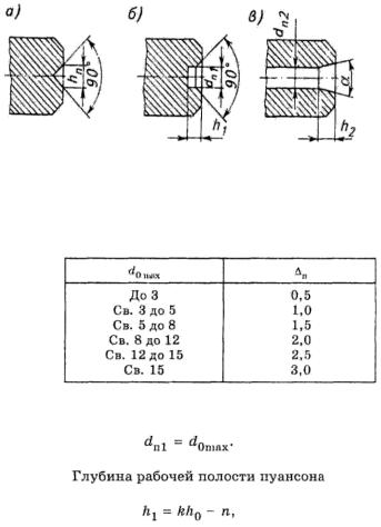 конуса); 2 — в пуансоне и матрице при малой глубине полости
