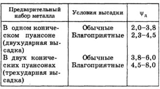 Высадка деталей за один удар из материала диаметром до 12 мм может быть осуществлена, если у = 1,7 …2,3. При высадке деталей большего диаметра ψд может быть увеличено до 2,3…2,6.