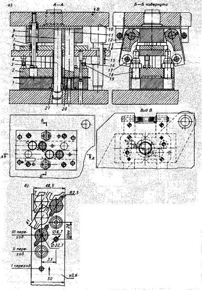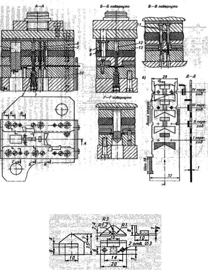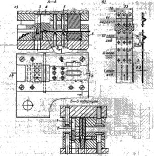 Рис. 4.79. Штамп последовательно-совмещенного действия для штамповки накладки замка застежки (а) и последовательность операции штамповки (б).