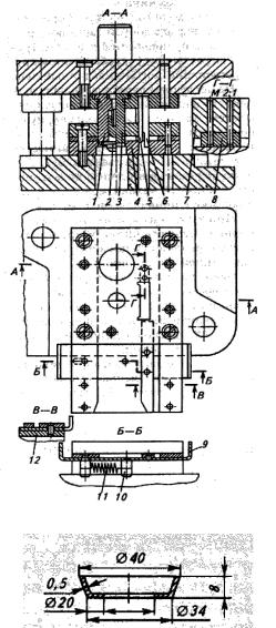 Штамп предназначен для вытяжки деталей типа колпачка (рис. 4.78) в латунной ленте с вырубкой готовой детали на последнем переходе.