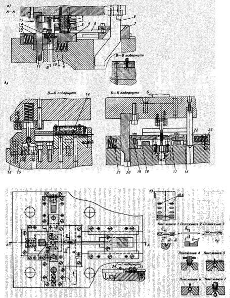 Рис.4.81. штамп последовательно-совмещенного для штамповки звеньев и сборки цепочки (а) и последовательность