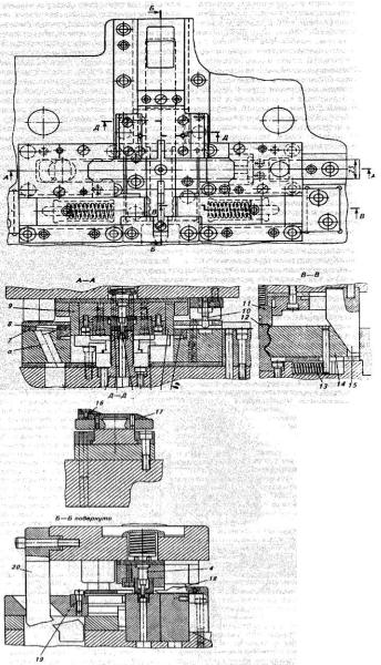 При подъеме ползуна заготовка прижимается вкладышем 5 и остается в нижней части штампа. Далее двусторонний клин 20 сообщает поступательное движение верхнему и нижнему шиберам 17 и 19, которые своими рабочими торцами перемещают предварительно согнутую заготовку на второй переход штампа. В момент, когда ползун пресса совершает рабочий ход, клин 20 возвращает шиберы назад, вкладыш 11 прижимает заготовку к оправке 12, а пуансоны 14 под действием клиньев 15 в это же время осуществляют окончательную (фасонную) гибку детали. Планка 18 служит для правильной фиксации положения полуфабриката на последнем переходе штампа. При следующем холостом ходе ползуна пружины 13 возвращают пуансоны 14 в исходное положение, а шиберы перемещают на второй переход следующую П-образную заготовку и удаляют из штампа готовую деталь. Чтобы лента при перемещении на шаг не упиралась в режущую кромку матрицы 8, сверху шибера 17 прикреплена планка 16, которая обеспечивает подъем подаваемой ленты над рабочим отверстием матрицы. Во время подачи ленты (ползун пресса совершает холостой ход) ее левый конец по скосам, имеющимся на верхнем шибере 17 и планке 16, поднимается, доходит до упора матрицы 8 и после возвращения шибера назад опускается на зеркало режущих матриц.