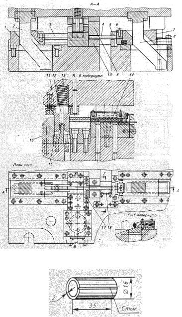 Лента, ширина которой равна длине изготовляемой втулки, подается через устройство 14 для чистки и смазки до упора 16 (см. сечение В—В на рис. 4.85). При опускании ползуна пу- ансон-матрица 11 отрезает заготовку необходимой длины и гнет ее на пуансоне 15 (переход I). При обратном ходе ползуна выталкиватели 12 под воздействием пружин 13 снимают с пуансона-матрицы предварительно согнутую заготовку, которая далее шибером 3, смонтированным на ползушке 1, перемещающейся под воздействием клина 2, подается на переход II. Для ориентации заготовки при ее передаче установлена направляющая планка 17. Окончательная гибка втулки производится при следующем ходе ползуна вниз пуансоном 9 на оправке 4 и матрице 10. Оправка закреплена в державке 6 , которая вместе с ползушкой 7 приводится в движение клином 8. Державка 6 позволяет оправке качаться в вертикальной плоскости во время гибки.