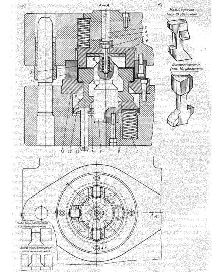Рис. 4.89. Комбинированный штамп для образования внутреннего фланца цилиндрической детали ( а ) и профили кулачков механизма управления работой штампа (б).
