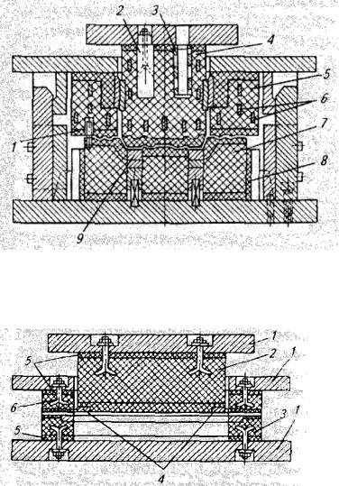 1 - упор: 2 - карман; 3 и 9 - вкладыши; 4 - пуансон; 5 - прижимное устройство: 6 - пояс; 7 - матрица: 8 - каркас.