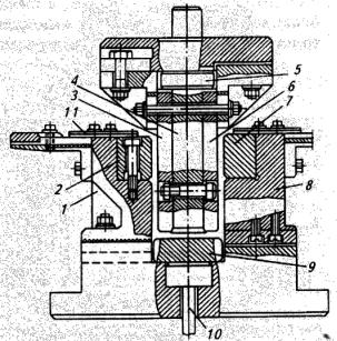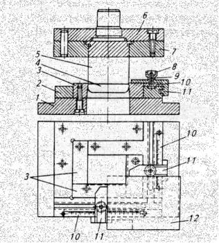 матрицы 2 и 7, имеющие на ребрах радиусы закругления 1, 2, 3 и 4 мм. Для ориентированной укладки заготовок на стойках устроены регулируемые фиксаторы 11.