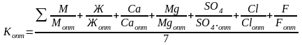 Критерием качества воды является коэффициент оптимальности Копт, который представляет собой аддитивную сумму отношений реальных концентраций макрокомпонентов и показателей в воде к их оптимальным величинам, формула 2: